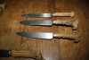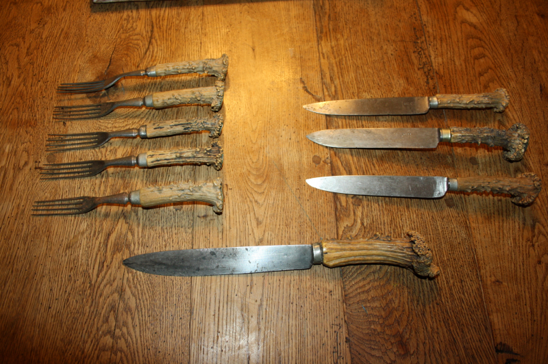 Ihr bietet hier auf Jagdliches Besteck 5 Gabeln, 3 normale Messer und ein großes Messer.
