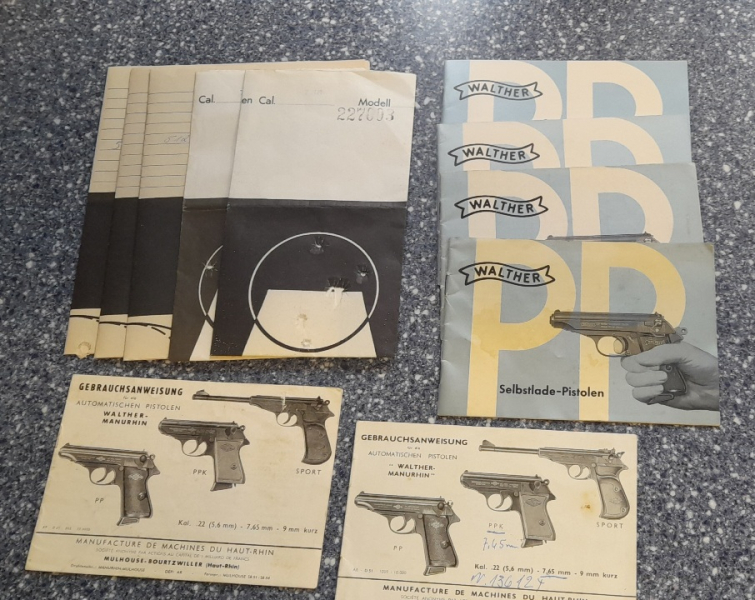 Angeboten ist ein Konvolut aus 5 Anschußscheiben und sechs Bedienungsanleithngen Walther PPK