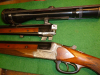 Bockflintenläufe 71 cm, mit Ejektor, alle Läufe spiegelblank, fachmännig verleimter Bruch an der rechten Seite des Pistolengriffs