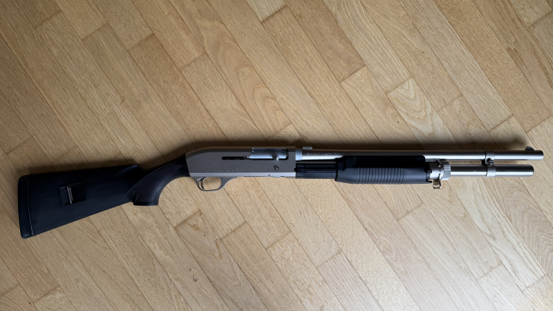 Angeboten wird eine Selbstladeflinte Benelli M3 Super 90 im Kaliber 12/76 in der Ausführung Stainless. Die SLF besitzt einen 50 cm Lauf mit offener Visierung, die Schaftlänge beträgt 36 cm und die Gesamtlänge 104 cm. Mit der Flinte wurden maximal 50 Schuss abgegeben, dementsprechend ist der Zustand neuwertig mit minimalen Gebrauchsspuren. Lauf und Verschluss sind spiegelblank. Die Flinte ist umschaltbar auf Repetierbetrieb und als Pumpgun nutzbar. Der Lauf besitzt einen Zylinderchoke.