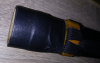 Außerdem ist die Original Stoffhülle des Schwertes in goldfarben im Innenfutter auf der Höhe des Stichblattes (der Zuba) eingerissen.