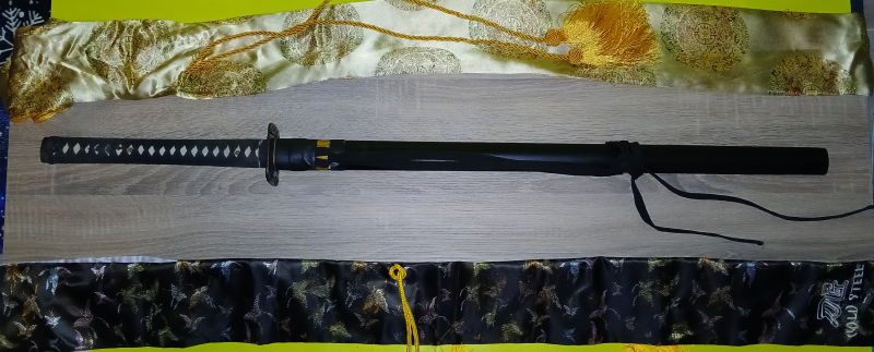 Zum Angebot kommt ein zwar gebrauchtes, aber immer noch scharfes und wuchtiges Katana, bzw. Ninjato mit gerader Klinge aus gefaltetem Kohlenstoffstahl einer mir unbekannten Schwertschmiede, mit einer ca. 73cm langen Klinge und einem ca. 30cm langen Griff inklusive der Originalaufbewahrungshülle und einer zweiten Hülle von Cold Steel.