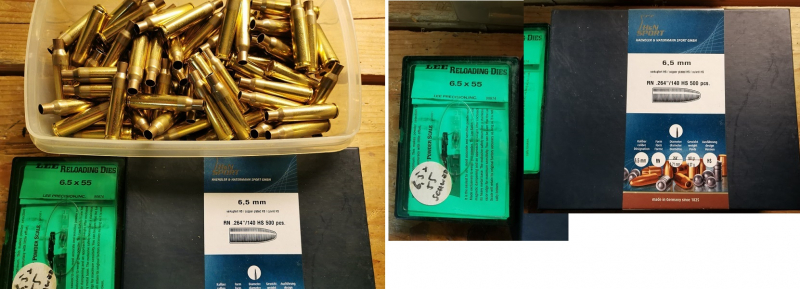 Aus Nachlass LEE Matrizensatz in 6,5x55 leicht benutzt, dazu 140 neue Hülsen von PPU, dazu noch 500 Stück Geschosse in HS, High Speed von