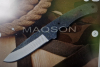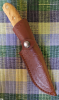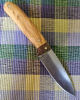 Klinge Carbonstahl, 1095 764 EA, 56 - 58 HRC, nicht rostfrei. Ursprünglicher Zustand der Klinge bei Lieferung (s. Bild), überarbeitet und poliert. Griffmaterial Oliven- und Nußbaumholz. Dazu passende Messerscheide, punziert (Internetkauf!)