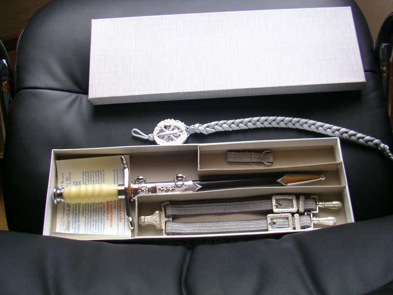 Wie auf Bild 4 ersichtlich ist, befinden sich auf der Rückseite der Scheide im unteren Drittel zwei kleine Flecken. Sie wurden von mir nicht bearbeitet. Die Schützenschnur gehört zum Set. Sie kaufen das, was sie sehen. Bilder sind Gegenstand der Beschreibung. Die Versendung erfolgt nur an die vorgemerkte Adresse nach Altersnachweis. Mehr Bilder gerne auf Anforderung. Fragen werden gerne beantwortet. Privatverkauf, keine Garantie oder Rücknahme. Nochmals "keine Versendung ins Ausland, NO international shipping.