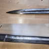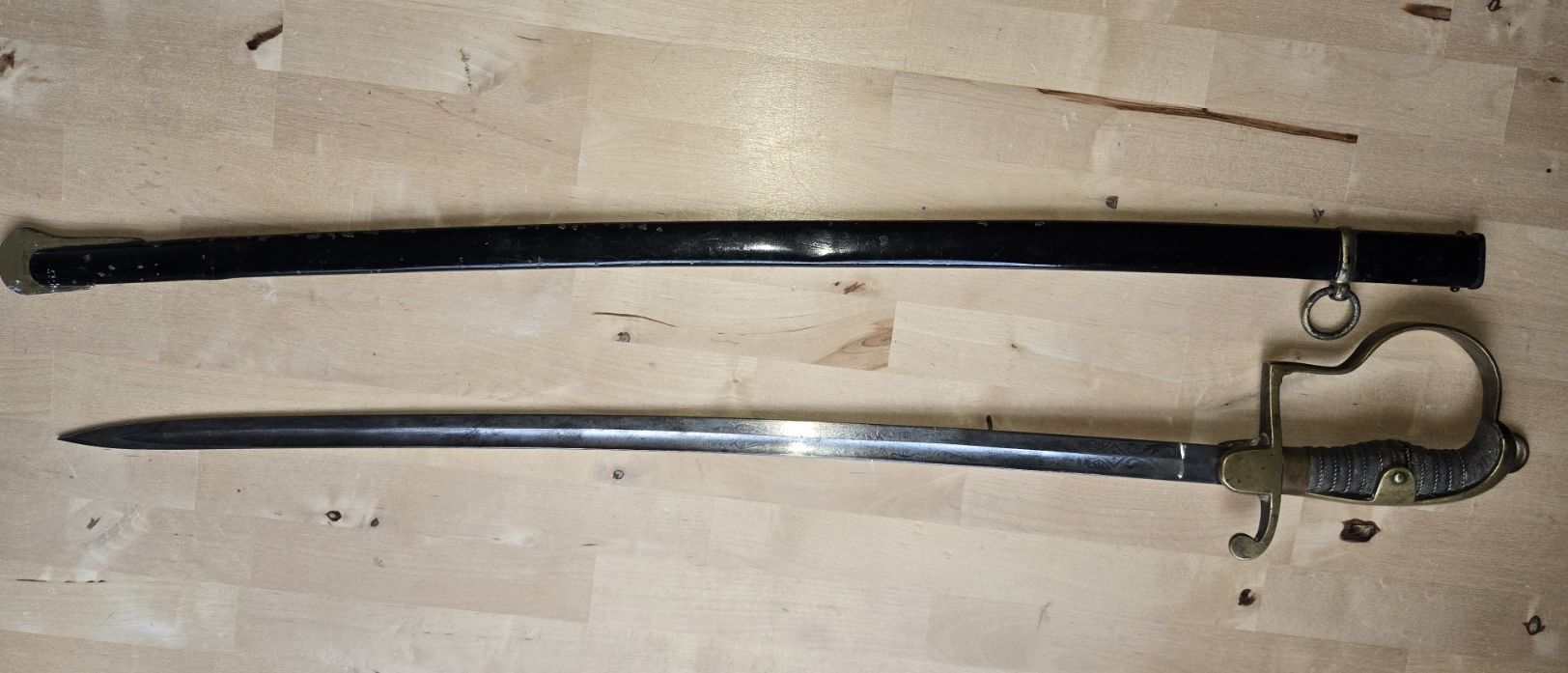 Die Waffe ist gebraucht, die Ziselierung/Ätzung ist teilweise erkennbar (Kanonen/Trophäen Lanzen), die Griffwicklung ist vorhanden, aber an einer Stelle gebrochen. Die Scheide hat eine Knickstelle, scheint gerichtet und teilweise überlackiert.