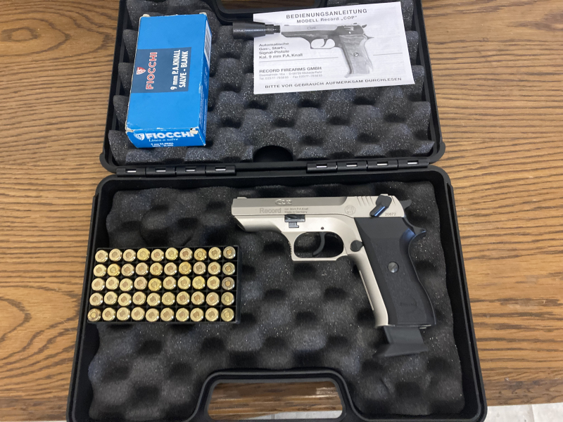 Record COP , Automatische Start Gas Signalpistole Stainless Kal.9mm PA siehe Bild UNGESCHOSSEN .Zubehör : Aufbewahrungskoffer 50 Stck Knallatronen