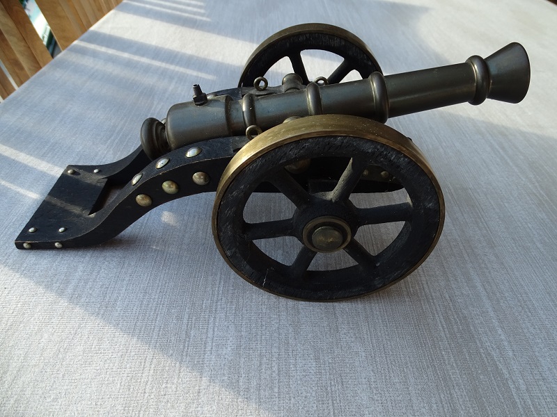 Sehr schöne Modellkanone, sehr stabile Ausführung, Rohr 23 cm lang in Messingausführung, Bohrung 16 mm, sehr stabile Räder, Durchmesser 115 mm mit Messingring, Gesamtlänge ca.30 cm, ca. 1,5 kg. Um welches Modell es sich handelt kann ich nicht sagen. Fragen per e-mail, keine Garantie und Rücknahme