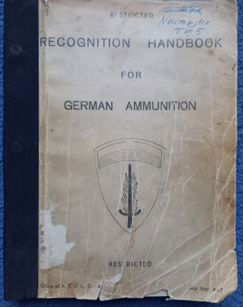 Biete eine Originale Dienstvorschrift der U.S.Army " RECOGNITION HANDBOOK FOR GERMAN AMMUNITION " Erkennungshandbuch für Deutsche Munition. 294 Seiten, zahlr. Abb.. Dies ist ein Privatverkauf ohne Garantie und Rücknahme.