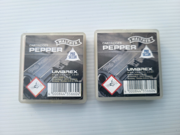 Sie kaufen 1 volle und eine angebrochene Packung Walther Pfefferpatronen (insges.) 15 Stück) im Caliber 9mm Pistole, abgelaufen 12/2025.