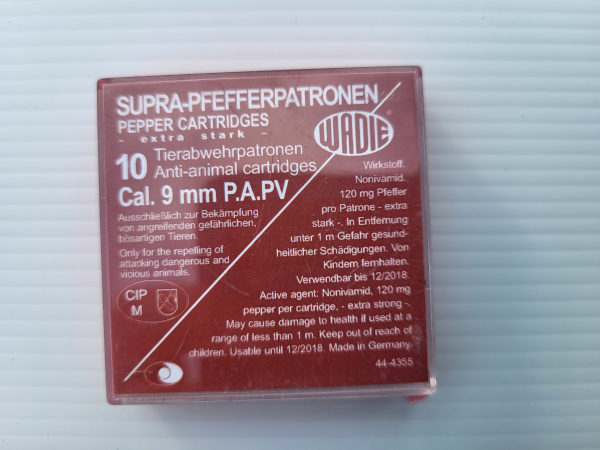 Sie kaufen eine Packung (10Stück) Wadie Supra-Pfefferpatronen i, Cal. 9mm Pistole, extrem Starke Pfefferladung, abgelaufen 12/2020 und 12/2018.