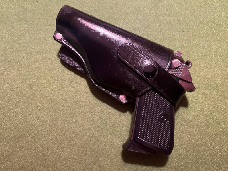 ist die dreifach, sehr stabil angenietete Platte, die Einsparung für den Gürtel ist lockere 50mm. breit. Inhalt auf den Beispielbilder sind Modelle der höchstwahrscheinlich dafür gedachten Waffen, die PP (Titelbild) und die PPK hier oben; eine Beretta der 70 Serie wie diese