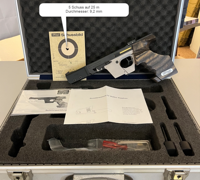 Neuwertige Waffe, wie abgebildet, inkl. original Koffer, Klappkorn und original Zubehör.
