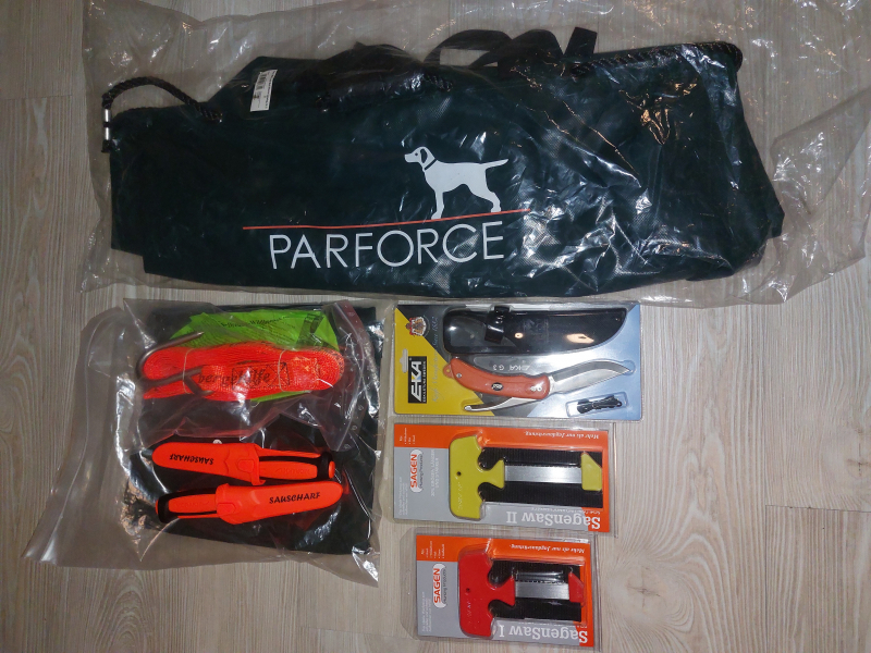 Parforce Faltwanne mit Fliegennetz als Wildbretschutz, Bergegurt, Eka Swingblade, 2xMoraknive und zwei Größen Sagen Saw 2 Knochensägen