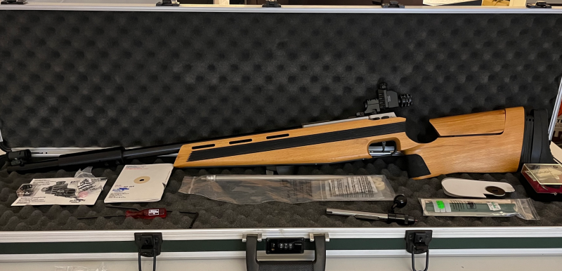 Waffe wie abgebildet im abschließbarem Koffer, Papiere, verstellbares Laufgewicht, Top Präsisionsdiopter, einige Korneinsätze, Putzstockführung.