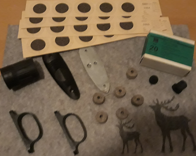 Verkaufe aus Nachlass dieses Konvolut fűr Schűtzen,unter anderem Scheibenstreifen,(6Stűck)Reinigungsfilze kal 12(6Stűck)'/Kal 20-VFG -Flinten Filzreiniger(Schachtel Orginal verschlossen)Inhalt 25 Stűck.,Schaftkappe plus Einlage,2 Abzugsbűgel Weihrauch,Okularschutzgummi( Augenmuschel)noch aus Altbestand,sowie Kleinkram..Verkaufe alle Teile zusammen wie auf dem Bild sichtbar,aus Nachlass bzw Krämerkiste..Ich benőtige es nicht daher zum Verkauf.Vielleicht kann es jemand brauchen..Schauen Sie sich die Bilder gut an,diese sind wesentlicher Bestandteil der Beschreibung(versicherter Versand)da Privatverkauf ohne Garantie oder Rűcknahme