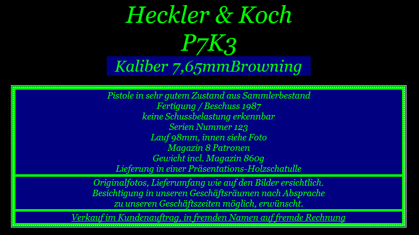 Artikel-ID: 20280280  •  ArtikelNr. des Verkäufers: 12798  •  Kategorie: Grosskaliber Kurzwaffen > Gebrauchspistolen > Heckler & Koch