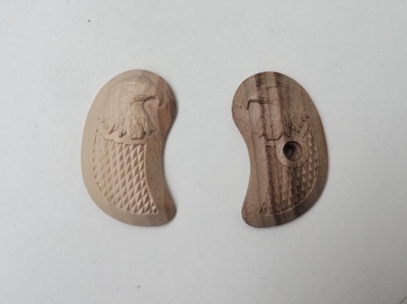 Die Griffschalen haben Adlerkopf-Gravur und sind unversiegelt auf der Oberfläche, damit der Verbraucher die Griffschalen nach seinem eigenen Wunsch färben (beizen), ölen oder wachsen kann.