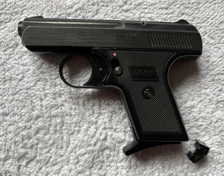 Zum Verkauf steht diese leicht defekte Pistole Schreckschuss Perfecta Mod. FBI 8000 von RECK im Kaliber 8 mm PAK. Das Magazin fasst 5 Kartuschen. Die Magazinkralle ist leider gebrochen, siehe Bilder. Ob die Funktionstüchtigkeit dennoch gegeben ist, bleibt FRAGLICH und ist MIR NICHT BEKANNT. Ich habe die Waffe vor Jahren gebraucht so bekommen und habe sie selbst nie abgefeuert. Der Original-Karton, die Bedienungsanleitung sowie der Schussbecher sind leider NICHT vorhanden. Beschuss-Amt Köln, Beschuss 1991. Siehe Bilder. Bei Fragen bitte melden. Um im Nachhinein Diskussionen auszuschließen, verkaufe ich die Pistole hier als gebraucht, ich bitte um Verständnis. Das ist ein Privatverkauf, daher keine Garantie oder Rücknahme. Der Versand erfolgt umgehend nach Zahlungseingang mit Hermes an die bei eGun hinterlegte Adresse.