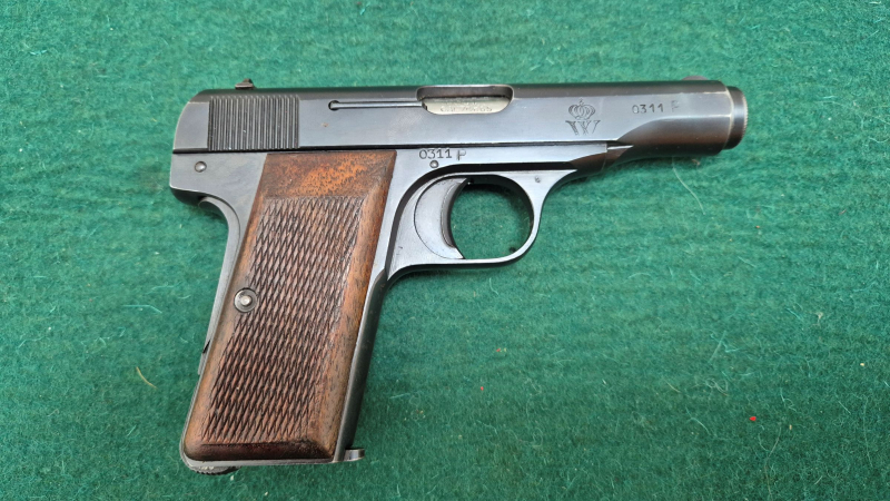 halbautomatische Pistole Kal 7,65 FN 1910 FN-Browning Patent Depose. Lauf blank, ganz leichte Tragespuren, Zustand sehr gut, Handballensicherung, nummerngleich