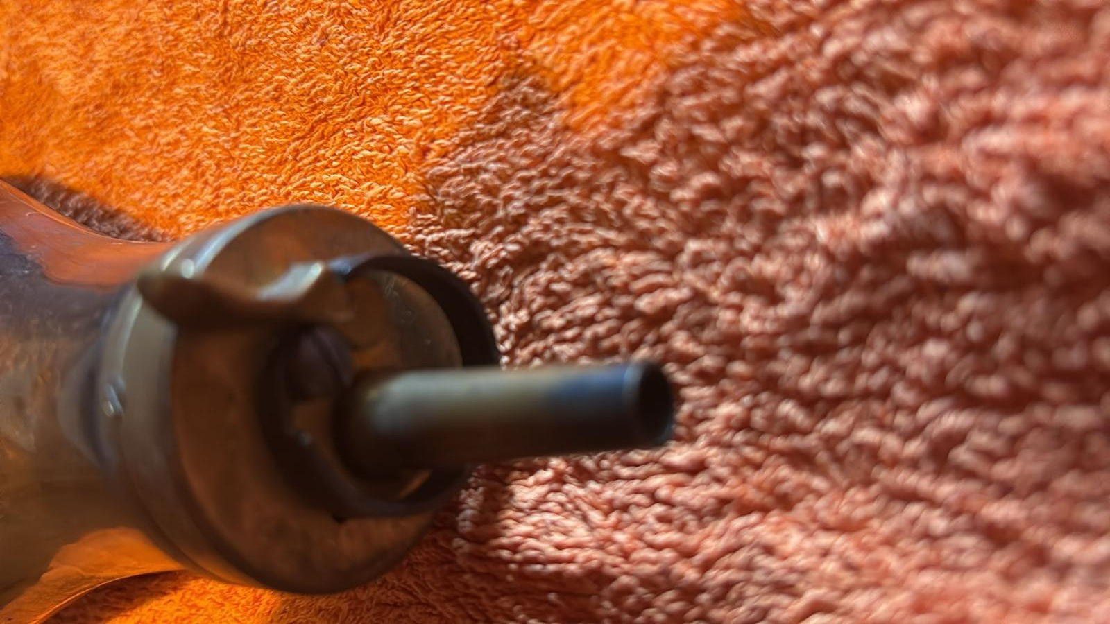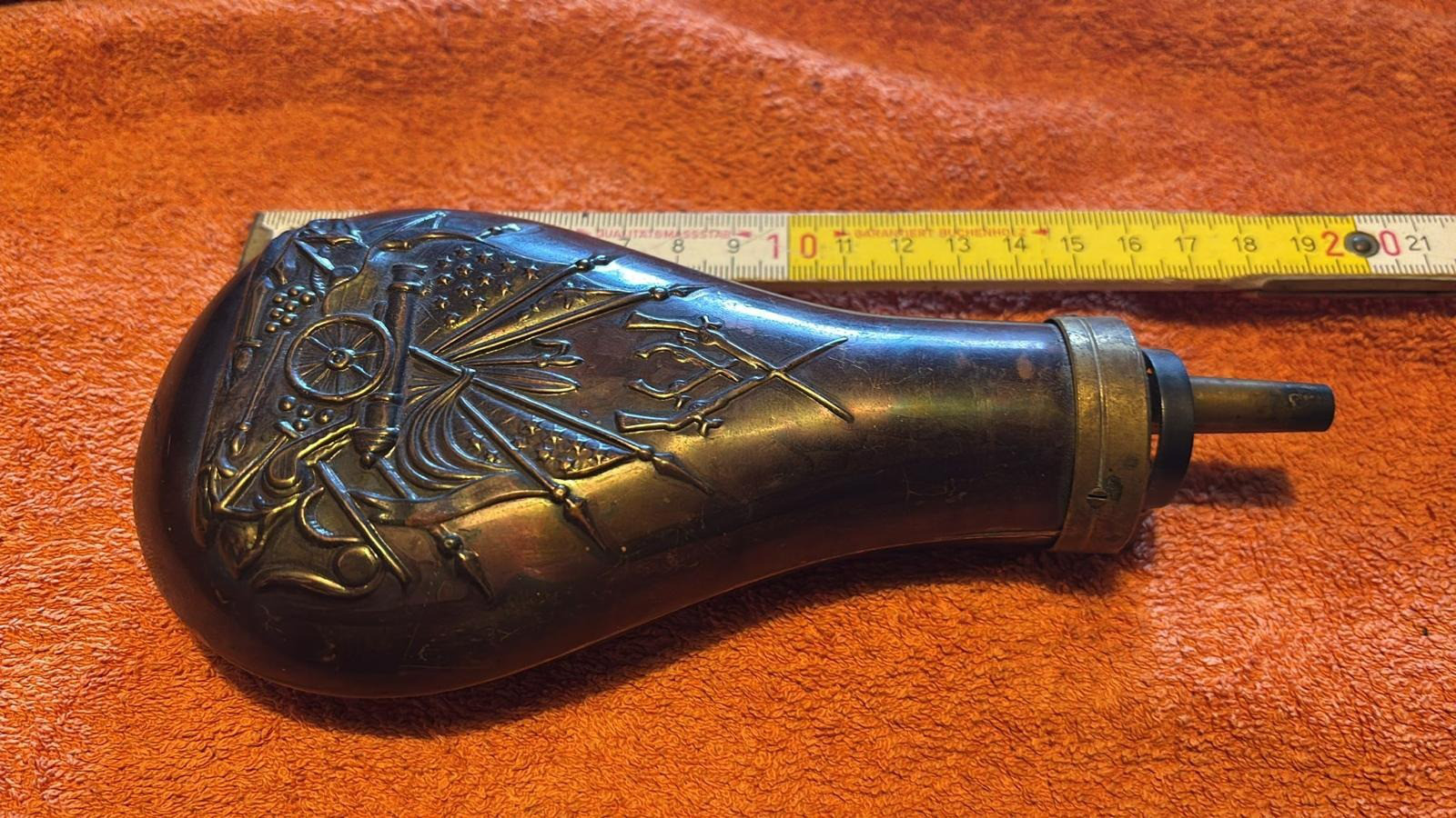 Diese alte Pulverflasche aus Kupfer ist m.M. nach bis auf kleine Beulen im guten Zustand.