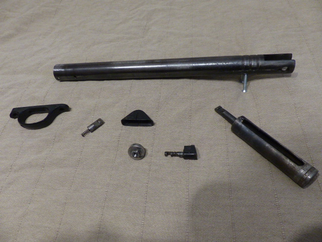 Haenel Teile für Repetierer/Knicker-Systemhülse Haenel 302 mit Schließkeil,Sicherungsbolzen,Schließkeil mit Feder,Abzugsbügel (neu),Kappe,Kolben mit Gebrauchsspuren.