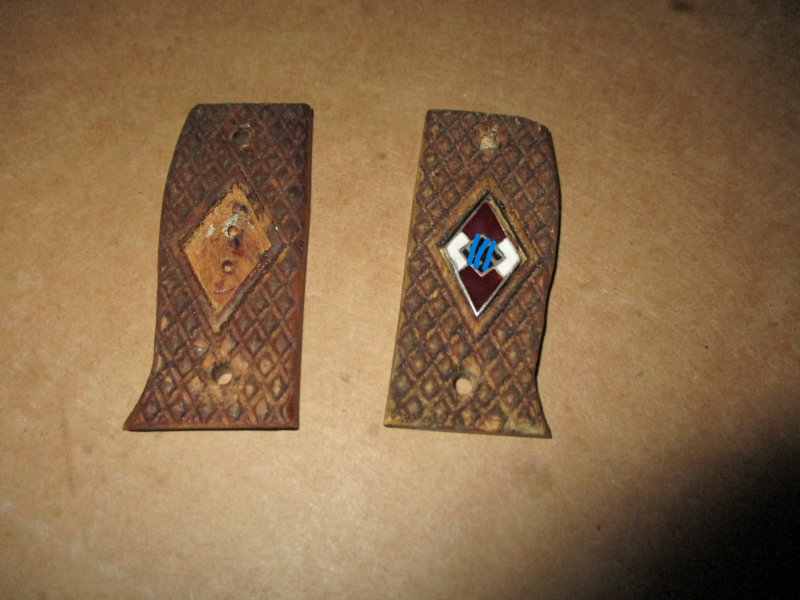 ich biete Ihnen hiermit ein paar Griffschalen aus Holz an. Auf einer ist eine HJ Raute eingeklebt. Ich habe keine Ahnung wofür die sein könnten. Sind auf jeden Fall keine Handarbeit, dafür sieht es zu gleichmäßig aus. Achten Sie auch auf meine anderen Auktionen.