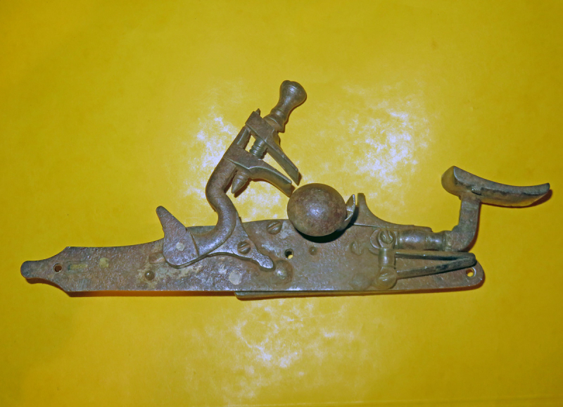 Großes Steinschloss Schnapphahnschloss, funktionsfähig mit starker Hahnfeder.