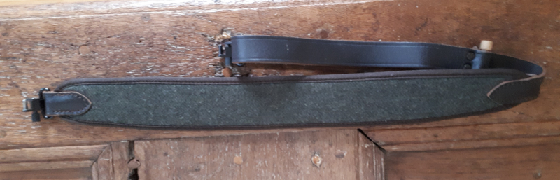 AKAH Gewehrriemen mit Knebel und Wechsel-Riemenbügel, leicht gebraucht. Der Dorn der Riemenbügel ist 3,42 mm für Aufnahmen an meinen Waffen etwas zu dick und passt daher nicht; der Riemen war ursächlich an einer Ruger No. 1 montiert.