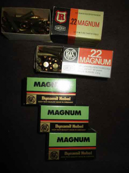 208 Patronen, .22Magnum RWS "Dynamit Nobel", davon 35 Stück VM, neue Verpackung, 23 Stück VM, alte Verpackung und 150 Stück HP, eine Fertigung, in