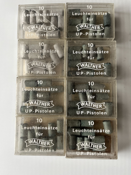 Angeboten werden 8 Originalschachteln a.10 Stück, Leuchteinsätze für Walther UP - Pistolen. Etwas für Sammler. Herstellungsjahr 1965. Die Gebrauchsanweisung ist teilweise vergraut, was nach über 60 Jahren einmal passieren kann. Die Garantie ist schon lange abgelaufen. Das ist ein Privatkauf, keine Rückgabe. Die Bilder sind Bestandteil der Auktion.