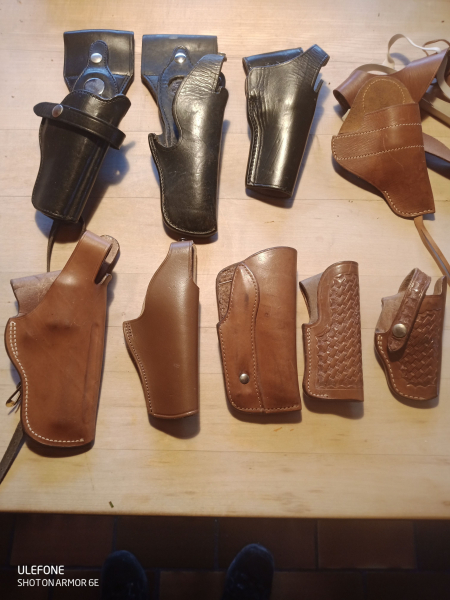 9 verschiedene Holster für Pistolen u. Revolver unterschiedlicher Größen.