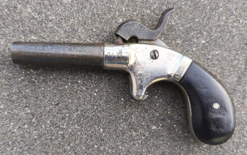 Vernickelter Systemkasten, seitlich 1878, auf Lauf und Rahmen gestempelte Nummer 1, zwei Rasten. Vernietete Griffschalen. Gesamtlänge 13,3cm.