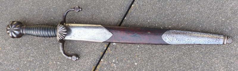 Scharfe zweischneidige spitz zulaufende Klinge, beidseitig Mittelgrat, sowie abgestetzte Fehlschärfe. Eisernes Parierelement nach unten gezogen und verziert, verzierte Muschel, großer dekorativer Knauf, Holzgriff mit Leder und Seil unterlegt, zwei Griffzwingen. Holzscheide beledert, fein geätzte bzw. geschnittene Eisenbeschläge, Ort mit Kugel in gleicher Weise. Rückseite mit Tragering. Gesamtlänge mit Scheide 51cm. Klingenbreite an der Fehlschärfe 30mm.
