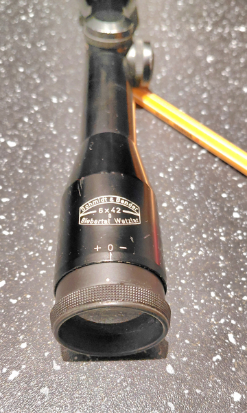 Schmidt & Bender, 6 x 42, ohne Schiene, zentriertes Abs. 1, Stahlrohr 26 mm Durchmesser.