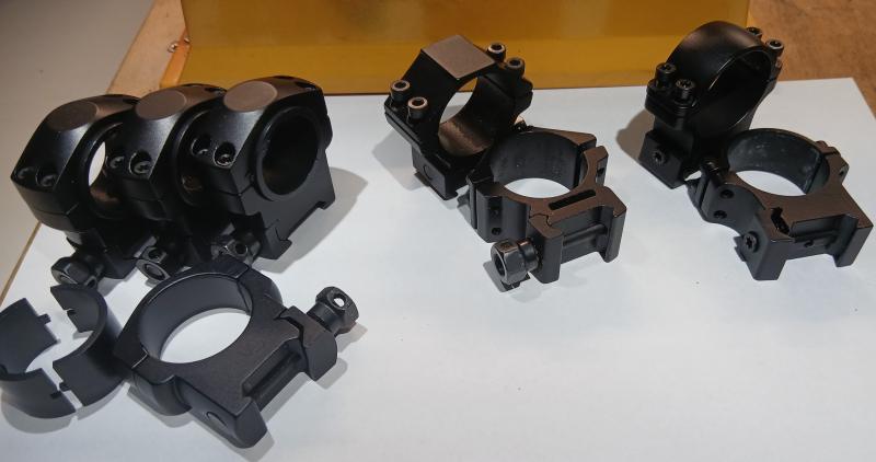 Zum Verkauf stehen 4 Paare Montageringe. Drei Paare müssten Alu sein, 1 Paar aus Stahl (erstes Foto ganz rechts). Das zweite Foto zeigt ein Firmenzeichen auf den Stahlmontagen. Vielleicht kann jemand etwas damit anfangen. Ich weiß den Hersteller leider nicht mehr. Die beiden Paare links im Bild sind neu und unbenutzt(Vector),inkl. Reduzierringen von 30 mm auf 25 mm, die rechten beiden waren montiert und haben die üblichen Gebrauchsspuren. Foto dient als Artikelbeschreibung. Bauhöhe ca 10mm (ohne Gewähr).