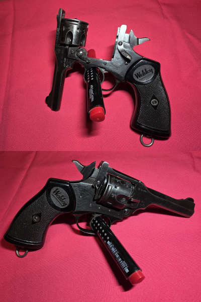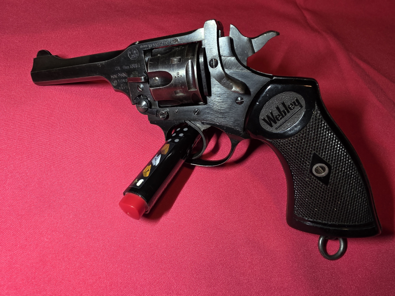 Angeboten wird ein umgebauter und ehemals scharfer Kipplaufrevolver Webley & Scott Mark IV aus Vollstahl mit einer Lauflänge von 4 Zoll.