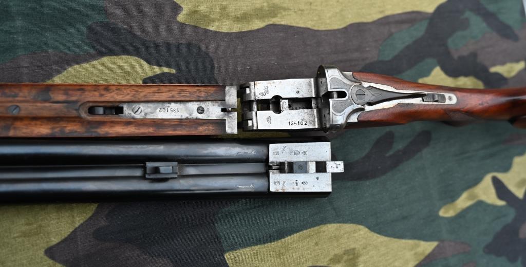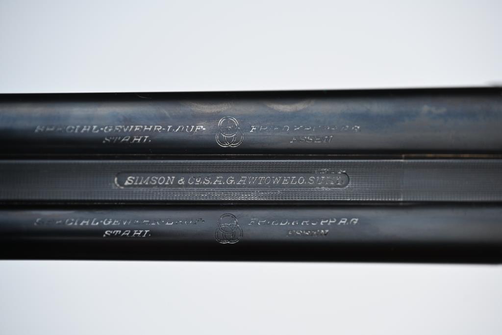 Herstellerschriftzug auf der Laufschiene „SIMSON & Co. S.A.G. AWTOWELO, SUHL (THÜRINGEN)“, auf beiden Laufoberseiten "SPECIAL GEWEHR-LAUFSTAHL FRIED. KRUPP A.G. ESSEN". Auf den Laufunterseiten jeweils drei KRUPP-Ringe und Schriftzug "Simson". Seriennummer, gültiger alter Suhler Ex-DDR-Beschuss, datiert 12 50 (= Dezember 1950), Nitrobeschuss, Suhler Wappen, Beschusszeichen unter Krone „W“ bzw. unter „N“. Kaliberangabe „16/70“ sowie "DR" im Oval.