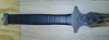 Auch wenn dieses Schwert aufgrund seiner schön gestalteten Blattformklinge ein wenig an das Schwert "Glamdring" von Gandalf erinnert, so ist es natürlich in keinster Weise mit wirklich hochwertigen Schwertern wie den vom berühmten Waffenschmied Peter Lyon aus Neuseeland, aus dessen Schiede die berühmten Blankwaffen der "Lord of the Rings" und der "Hobbit" Trilogien stammen, dafür handelt es sich um eine ganz nettes Schwert was für Dekozwecke vollkommend ausreichend ist, optisch durch seine schöne Form beeindruckt und obendrein aus Federstahl hergestellt wurde und nicht aus irgendeinem billigen Edelstahl und dank der noch zu sehenden Bearbeitungsspuren sowie der noch vorhandenen Zunderreste auf der Klinge so wird dem Schwert noch ein gewisser rustikaler "Used-Look" verliehen!