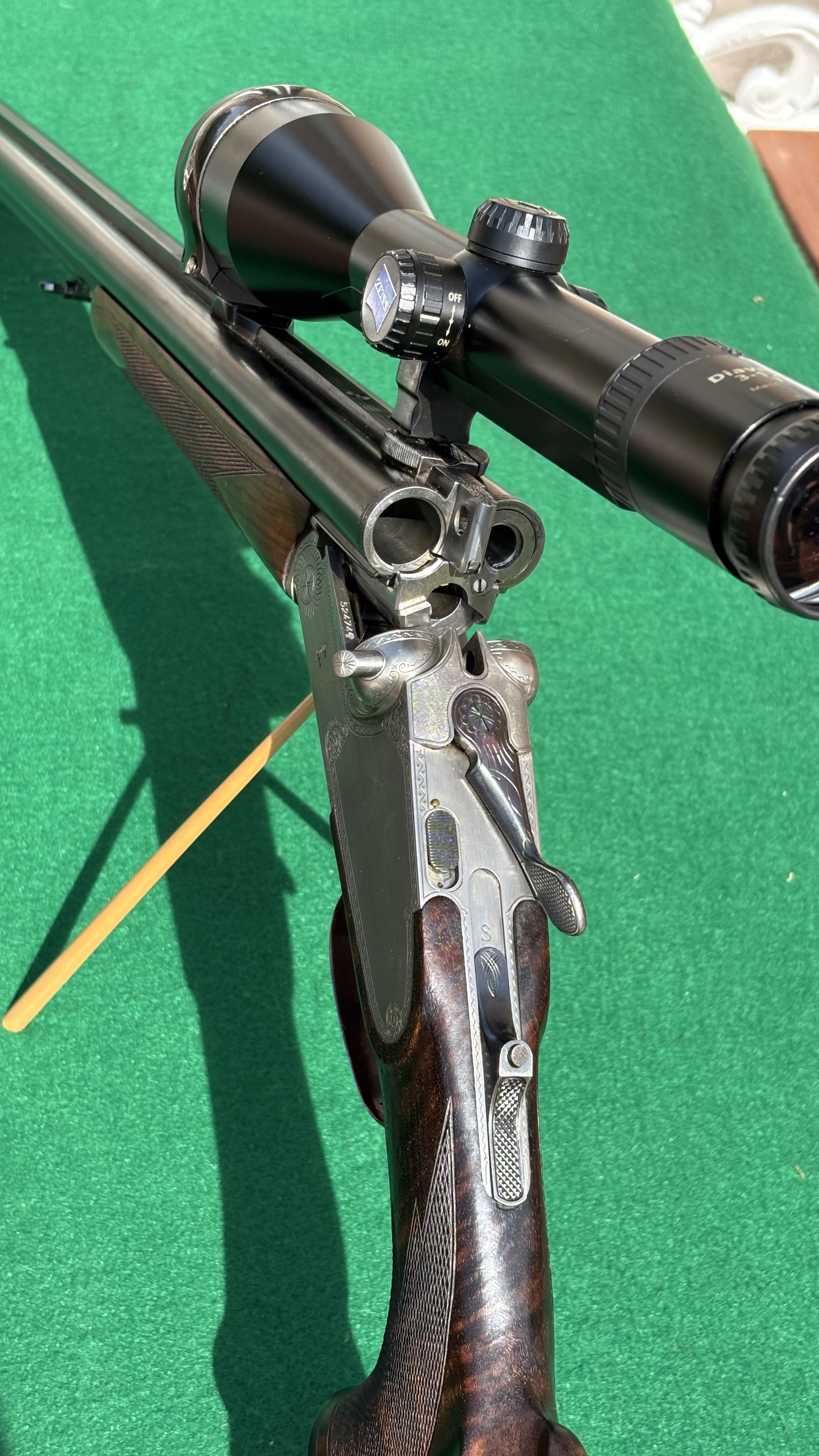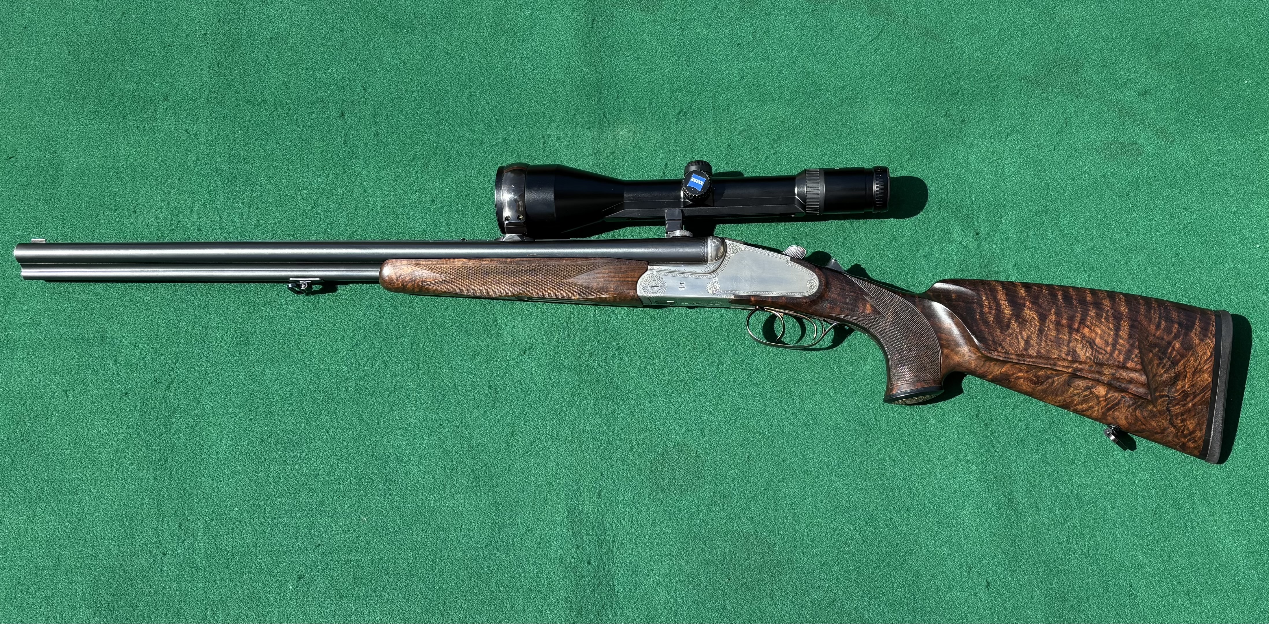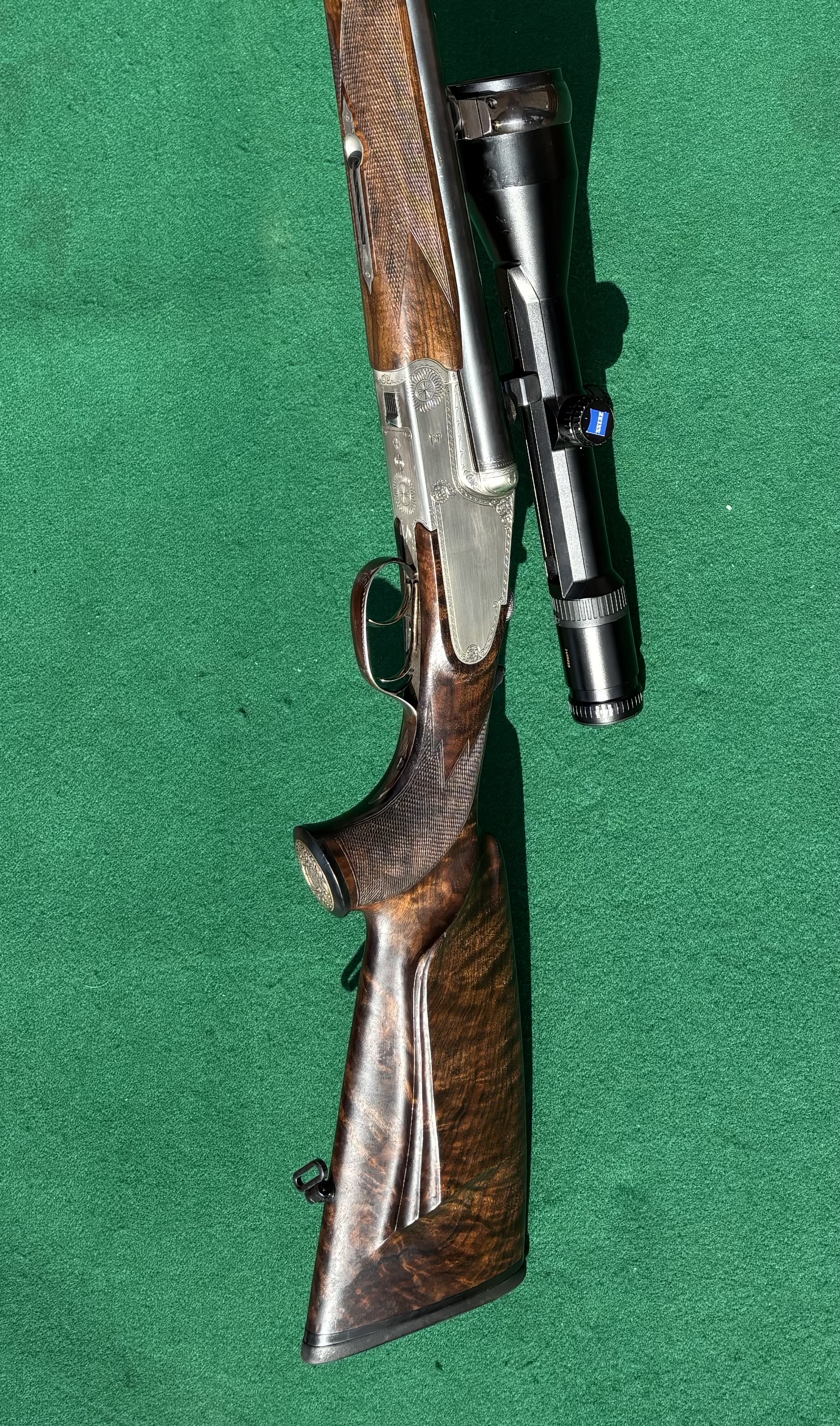 Zum Verkauf steht ein wunderschöner Heym Seitenschloss-Drilling Nr. 52474 mit Zeiss Diavari 3–12×56 T* (Abs. 40) auf Suhler Einhakmontage (SEM). Die Kaliberkombination 16/70 – .30-06 – .30-30 Win macht die Waffe extrem jagdpraktisch und vielseitig – vom Niederwild bis zum starken Hochwild, auf Pirsch wie Ansitz. Besonders hervorzuheben ist die Seitenschloss-Ausführung, die bei solchen Kombinierten nicht nur „schön“ ist, sondern im Alltag vor allem durch ein sehr sauberes Schloss-/Abzugsgefühl, einen klassisch servicefreundlichen Aufbau und insgesamt das Premium-Finish überzeugt.