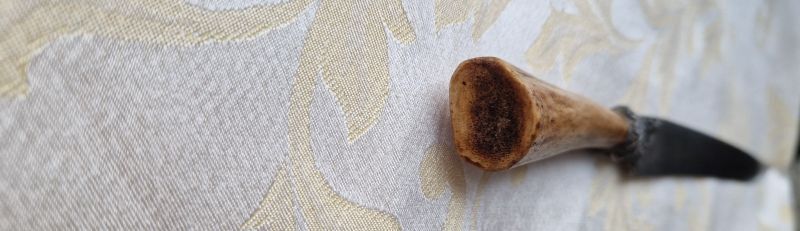 Geschwungene Damast Rückenklinge. Silberne verzierte Grifffassung. Hirschhorngriff nach oben ausgestellt.