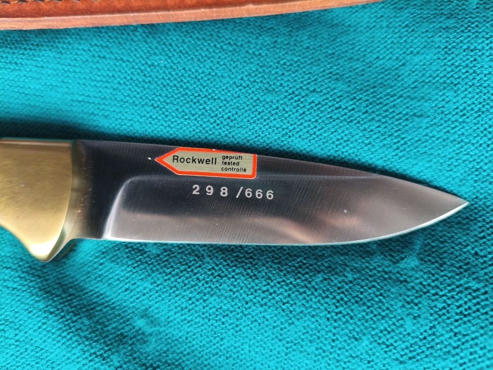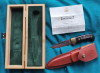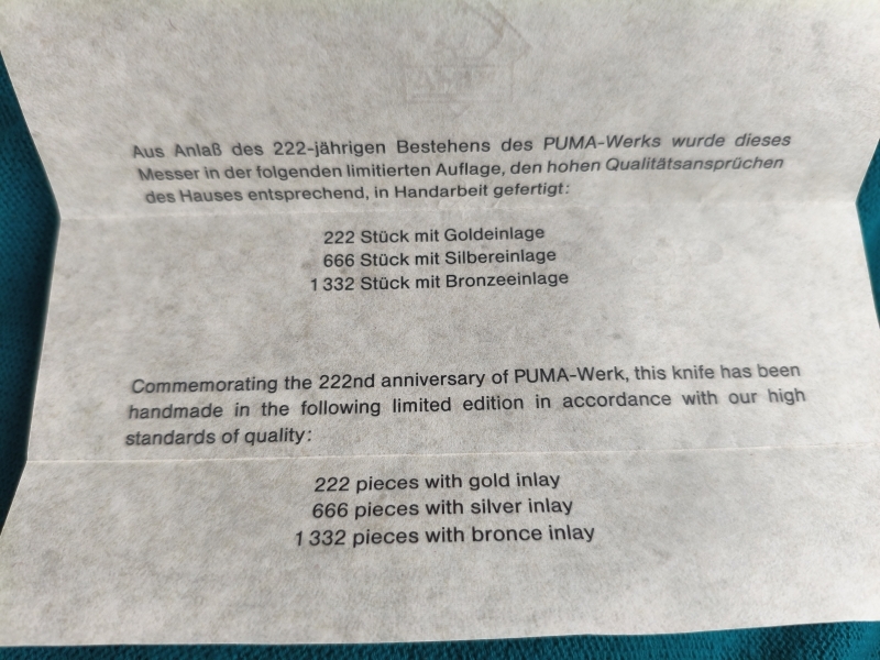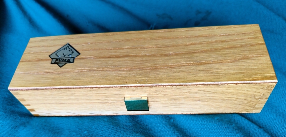 Signierte Klinge, Hartholzgriff mit eingelegtem Silberlöwe, 222 Jahre Puma, orig. Scheide und Holzkassette mit Aufschrift auf Deckel sowie seitlich. Gesamtlänge Messer 20,6cm.