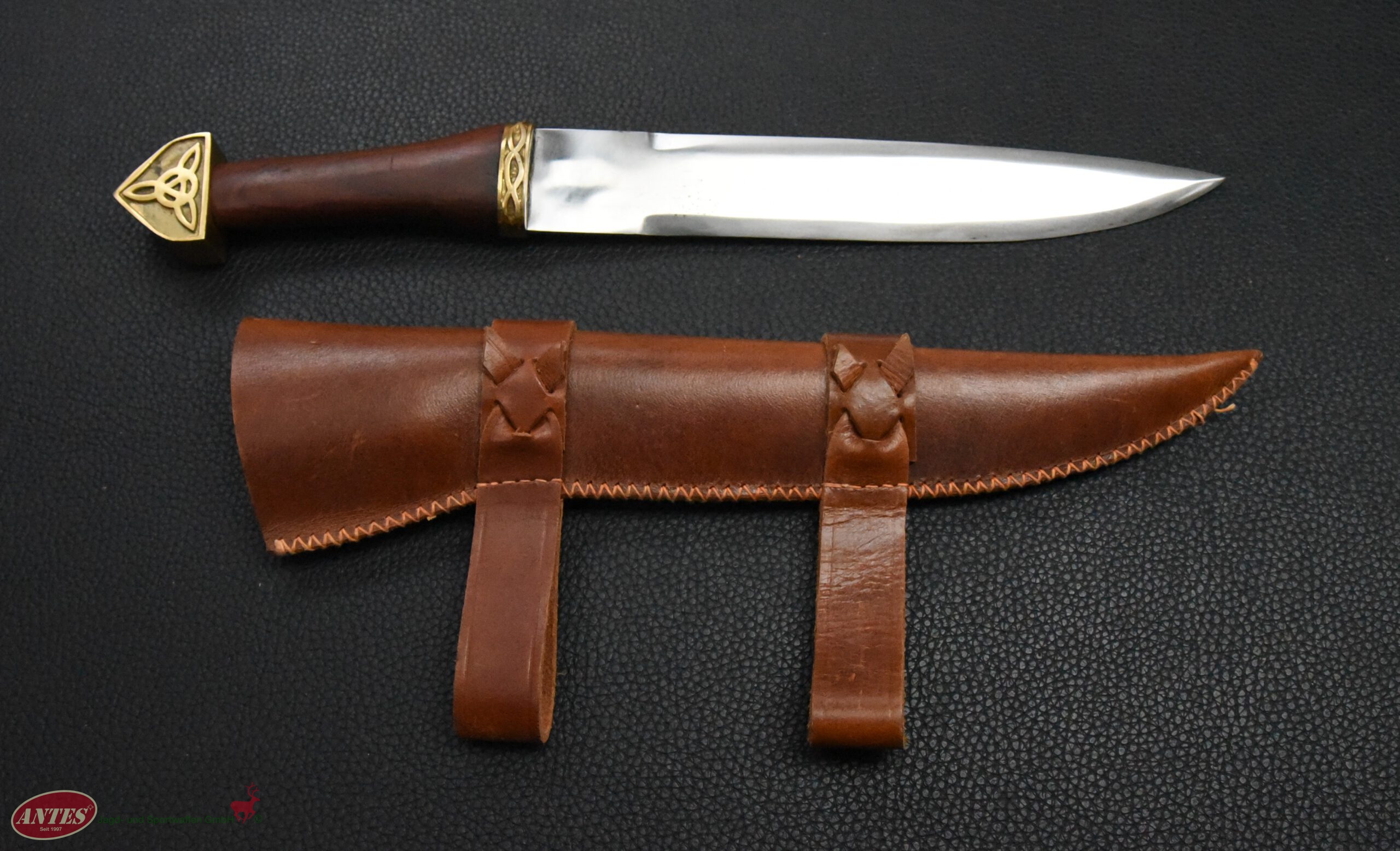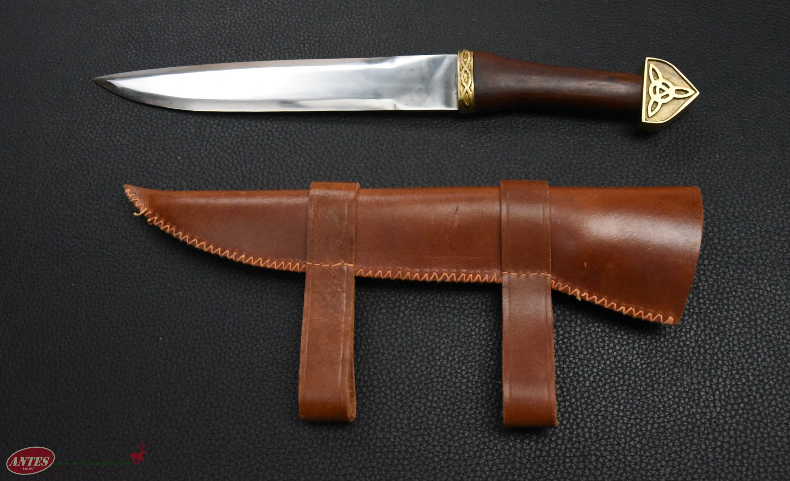 Wikinger Sax mit Lederscheide, Holzgriff und Messingknauf