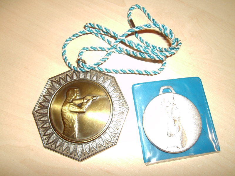 1 x 8eckig bronzefarbig Durchmesser 8 cm in der Mitte eine Medaille mit Schütze und einer Kordel zum Umhängen. Auf der Rückseite Herstellermarkierung.