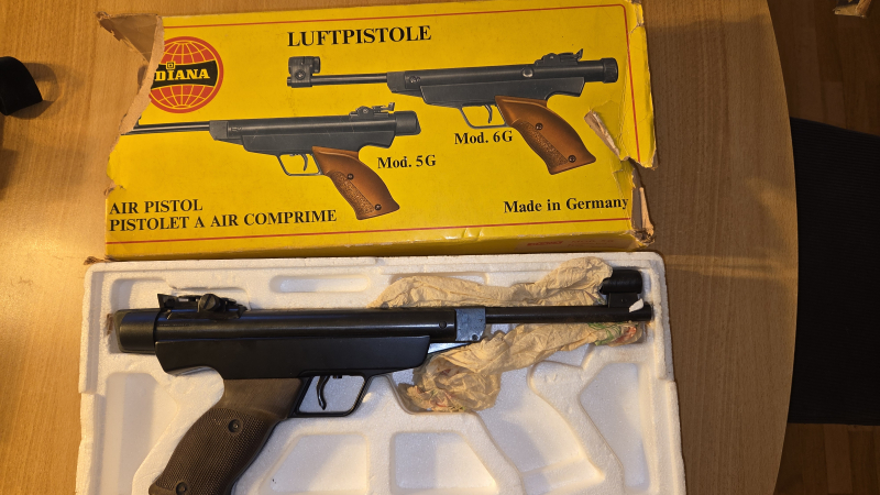 Biete hier eine Luftpistole der Marke Diana, Model G5 an. Leichte Spuren von Flugrost. Artikel ist im Originalkarton.