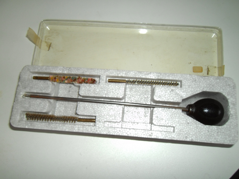 Älteres Putzzeug mit 3 Bürsten: 1x Putzstock aus Edelstahl mit Holzgriff mit einem Durchmesser von 3,5 mm und einer Wischlänge von ca. 25 cm. 1x Bronzebürste Kaliber 4 mm, 1x Borstenbürste Kaliber 4 mm, 1x Wollwischer Kaliber 4 mm.