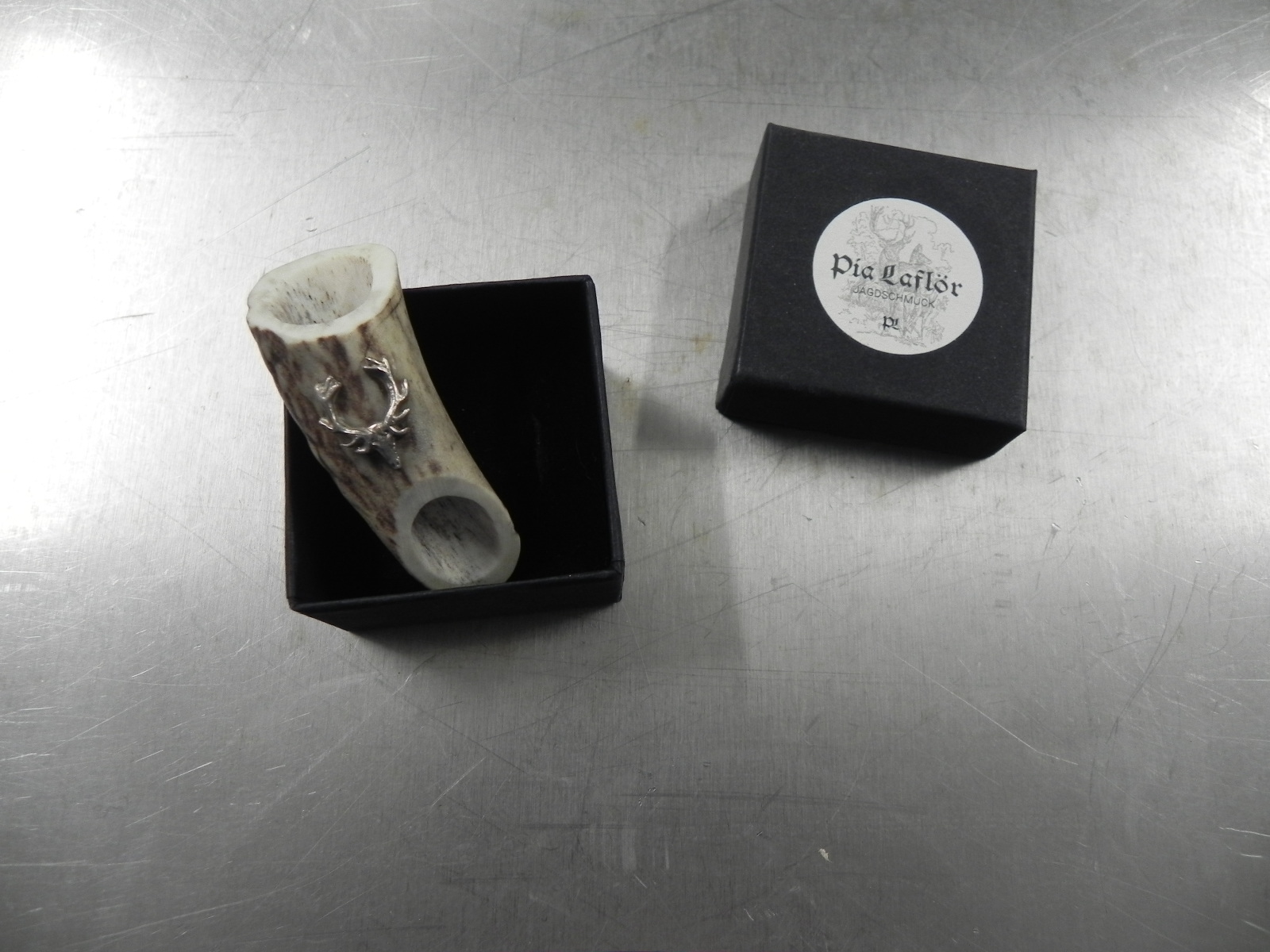 Zum Verkauf steht ein ungebrauchter Bruchhalter der Goldschmiedin Pia Laflör. Er ist ideal für den Jagdhut oder die Jagdmütze um den Erlegerbruch anzustecken. Er ist aus einer Geweihstange vom Rothirsch hergestellt und werten die jagdliche Kopfbedeckung auf.