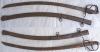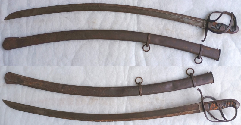 Stahlgefäß mit 2 Nebenbügeln und geschlossenem Griffrücken, keine Markierungen. Griff beschädigt. Herstellermarke Ritterkopf (Kirschbaum, Solingen). Schartige Klinge, insgesamt Flugrostig, Scheide mit 2 Trageringen.