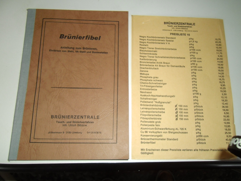 Brünierfibel. Anleitung zum Brünieren, Einfärben von Stahl, VA-Stahl und Buntmetallen. (Brünierzentrale Tauch- und Streichverfahren). Ulrich Blödow, Verlag: Selbstverlag, Lüneburg. 1990.
