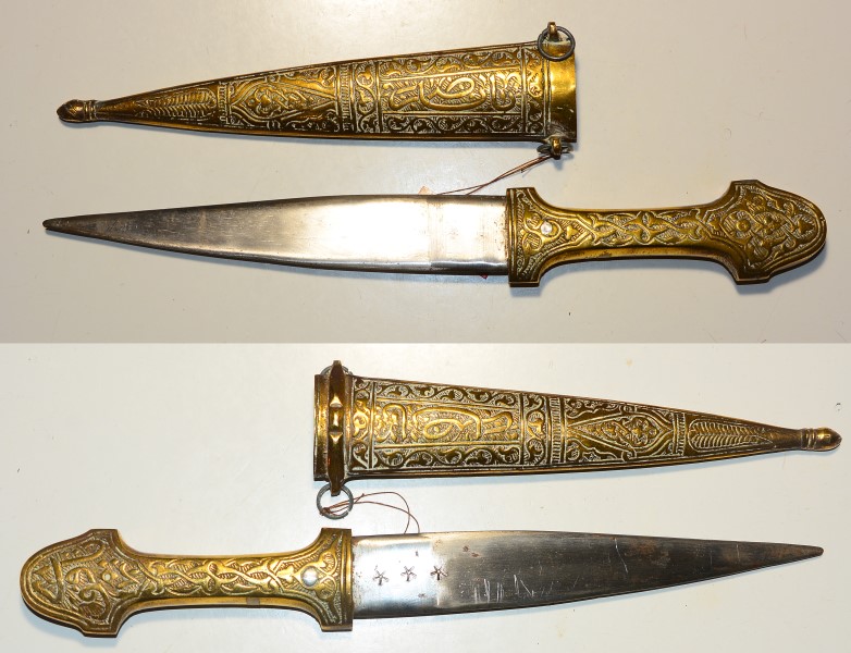 Zierdolch im nordafrikanischen Stil wohl 2. Hälfte des 20. Jahrhunderts, schwerer Messiggriff und Messingscheide, einfache 17,5 cm lange Klinge